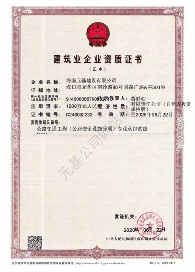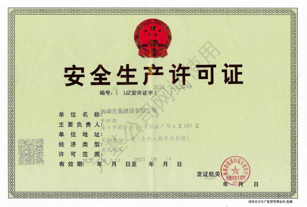 元基公司于2020年8月14日獲得由海南省住房和城鄉(xiāng)建設(shè)廳頒發(fā)的公路交通工程專業(yè)承包貳級(jí)建筑業(yè)企業(yè)資質(zhì)證書(shū)和安全許可證,現(xiàn)在可持證開(kāi)展經(jīng)營(yíng)業(yè)務(wù)。
